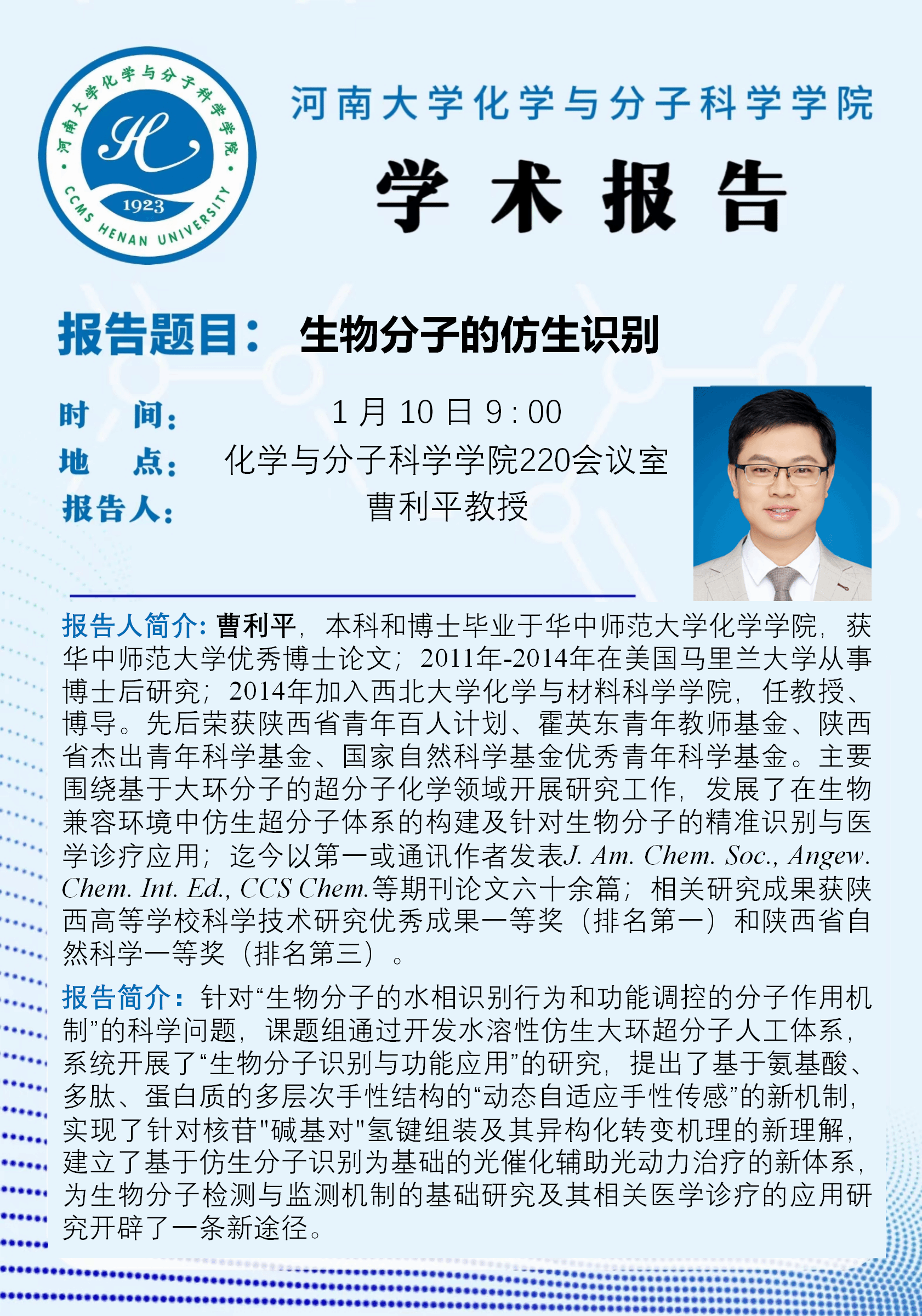 曹利平:生物分子的仿生识别(时间:1月10日)