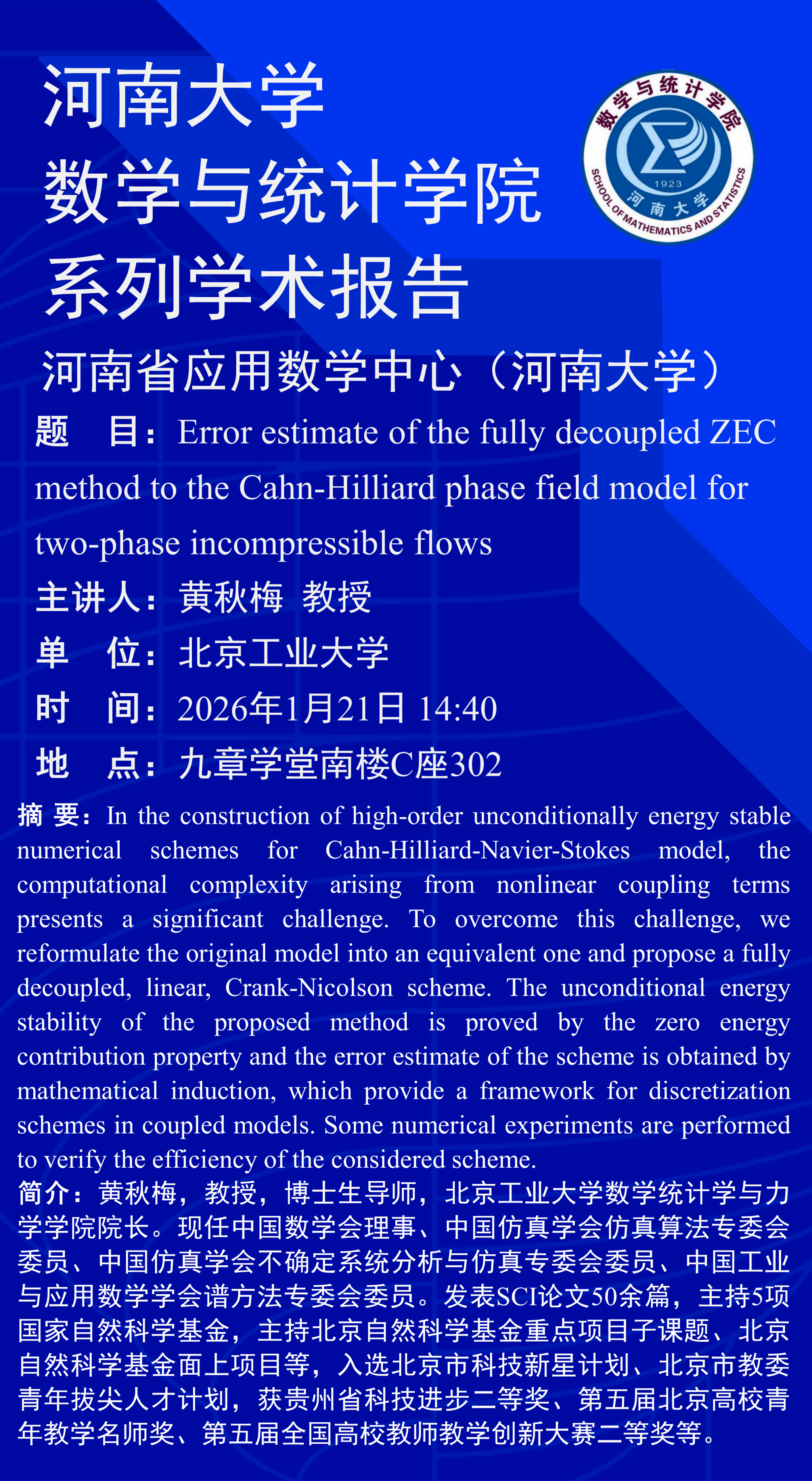黄秋梅:Error estimate of the fully decoupled ZEC method to the Cahn-Hilliard phase field model for two-phase incompressible flows(时间:1月21日)