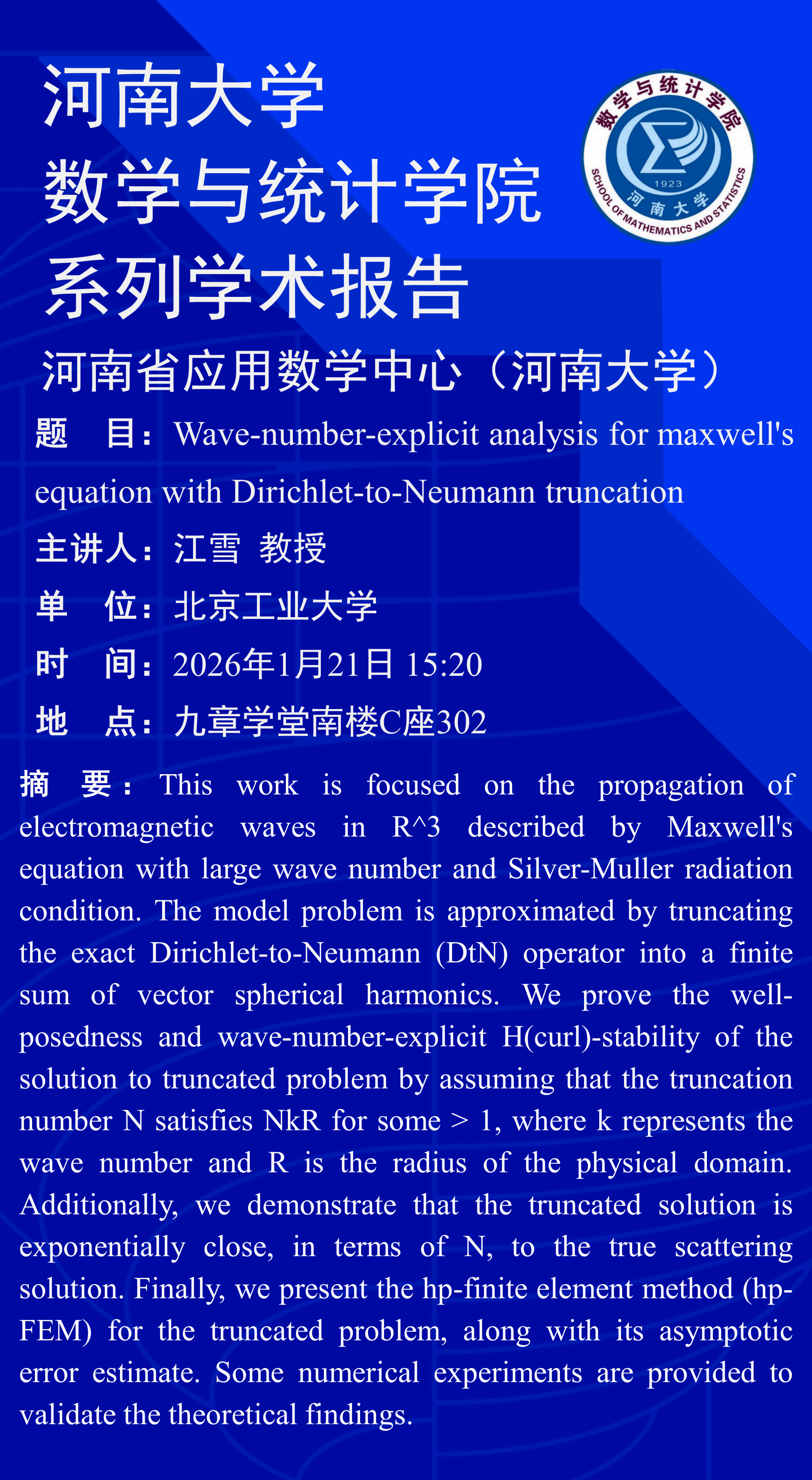 江雪:Wave-number-explicit analysis for maxwell's equation with Dirichlet-to-Neumann truncation(时间:1月21日)