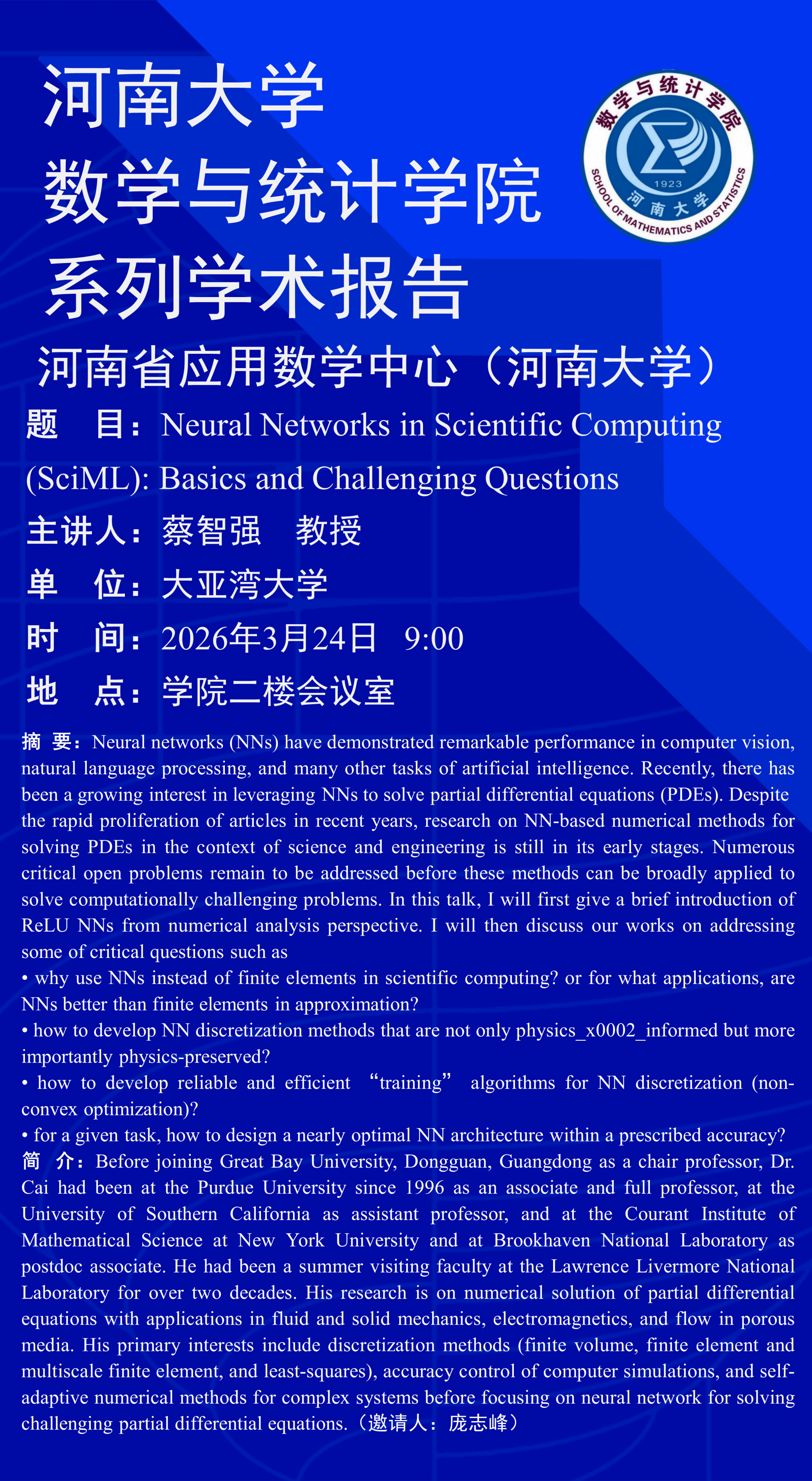 蔡智强:Neural Networks in Scientific Computing (SciML): Basics and Challenging Questions(时间:3月24日 )