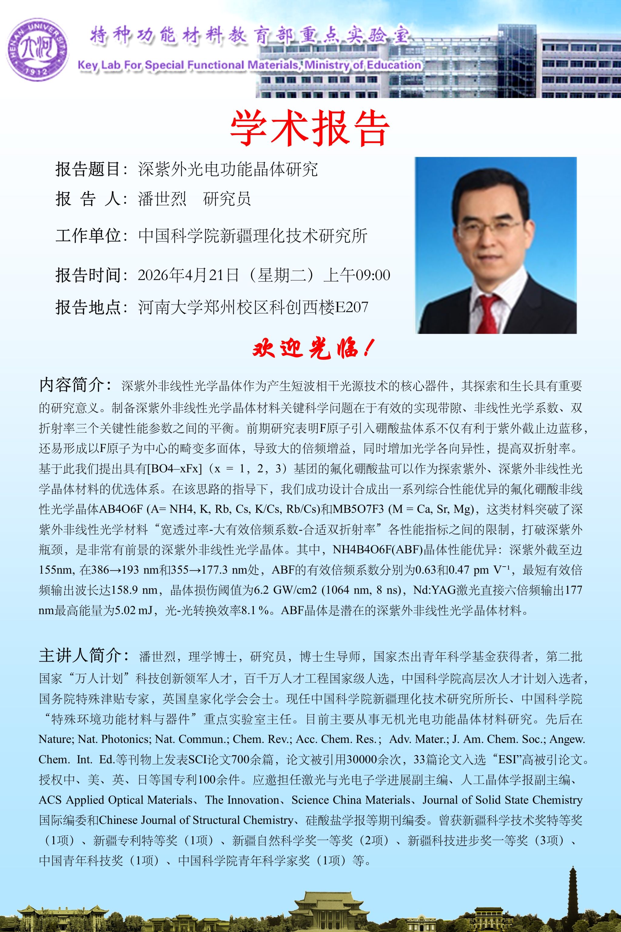 潘世烈:深紫外光电功能晶体研究(时间:4月21日)