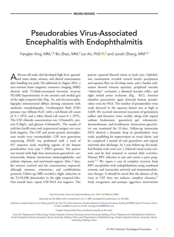 近日,淮河医院神经内科(康复医学科)张俊士团队联合医学院安磊团队和眼科赵博团队在临床神经病学顶级期刊《神经病学年鉴》(Annals of Neurology)发表题为“Pseudorabies virus Associated Encephalitis with Endophthalmitis”的研究论文。《神经病学年鉴》作为美国神经病学协会(ANA)和儿童神经学会的官方期刊,是临床神经病学专业顶级期刊。