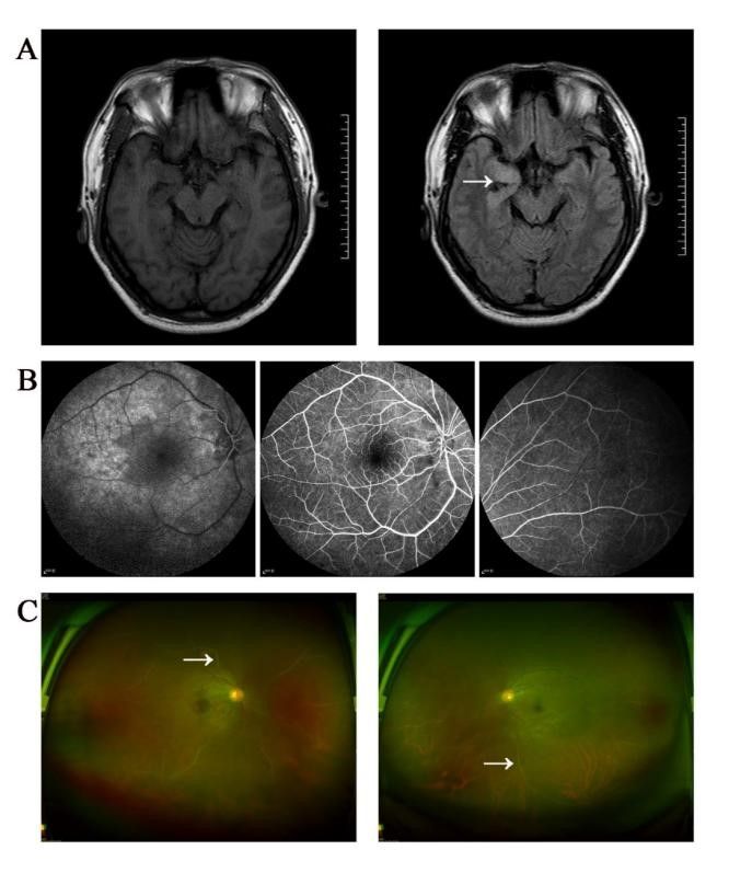 图示:(A):磁共振成像T2-FLAIR显示颞叶前部和内侧部有略高信号(箭头所示);(B):眼底动脉造影显示动脉充盈迟缓,部分血管闭塞,血流呈串珠样改变;(C):眼底镜检查显示玻璃体混浊,视网膜周边部分血管闭塞,呈“白线样”特征(箭头所示)。