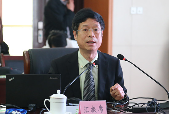 药学院院长李钦就中药学专业建设情况从学院概况、宗旨和目标、学科管理、教育计划、学生评价、师资队伍、教育资源、教育评价、学生发展、科学研究、教学管理与行政、改革与发展十二个方面进行汇报。