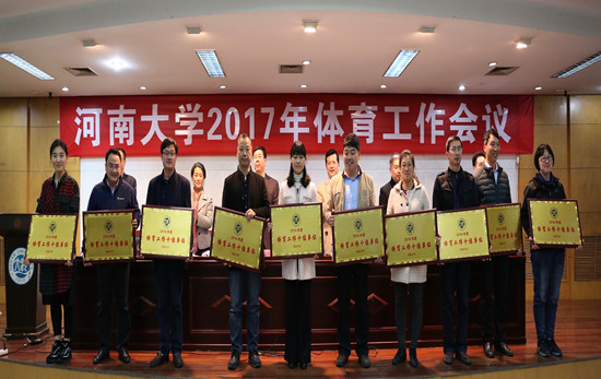 校体委副主任、公共体育教研部主任洪浩向大会做了2016年度学校体育工作和2017年的工作报告,校体委副主任、教务处处长李捷报告了我校2016年度体质健康测试情况,校体委副主任、学生处处长陈灿宣读了学校关于表彰2016年度体育工作先进集体和先进个人的决定。文学院、艺术学院、化学化工学院、数学与统计学院、基础医学院、药学院、护理与健康学院、国际汉学院、经济学院、纳米材料工程研究中心被评为2016年度我校体育工作十佳单位,阳光长跑协会、孙氏太极拳研究会、太极拳协会、自行车协会、双截棍协会、乒乓球协会被评为2016年度优秀学生体育社团。万合利等45人被评为2016年度体育先进工作者。王一帆等53人被评为2016年度体育新闻宣传先进个人。体育学院和公共体育教研部被评为2016年度体育工作突出贡献奖。