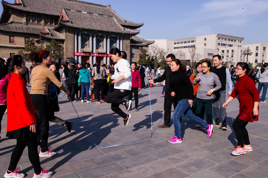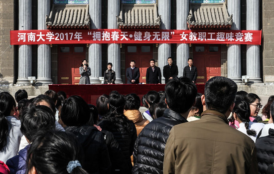 腊尽见春回,枝头花又开。为庆祝第107个“三八”国际劳动妇女节,3月2日下午,由校工会主办、公共体育教研部承办的“拥抱春天•健身无限”女教职工趣味竞赛活动在明伦校区举行。校党委常委、副校长张宝明,以及相关单位负责人出席了本次活动。活动仪式由校工会副主席、女工委员会主任宋菊芳主持。