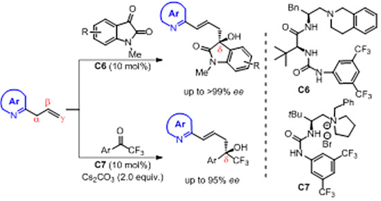 江智勇博士课题组使用自行设计并发展的二肽衍生脲−酰胺−叔胺作为布朗斯特碱催化剂(Chem. Sci. 2016, 7, 6060−6067)以及基于氨基酸衍生(硫)脲−叔胺(Angew. Chem. Int. Ed. 2012, 51, 10069–10073; Angew. Chem. Int. Ed. 2013, 52, 6666–6670; Org. Lett. 2013, 15, 2358−2361; Angew. Chem. Int. Ed. 2016, 55, 1299−1303)衍生的脲−季铵盐相转移催化剂(J. Org. Chem. 2015, 80, 7770−7778),实现了2-烯丙基含氮芳香杂环与靛红以及三氟苯乙酮的γ-位选择的烯丙基化反应,高立体选择地合成了系列叔醇位于δ-位的重要手性含氮芳香杂环化合物。