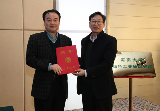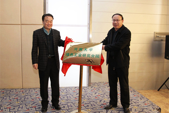 王明钦与李洪彦教授(左)为河南大学绿色工业研究分院揭牌