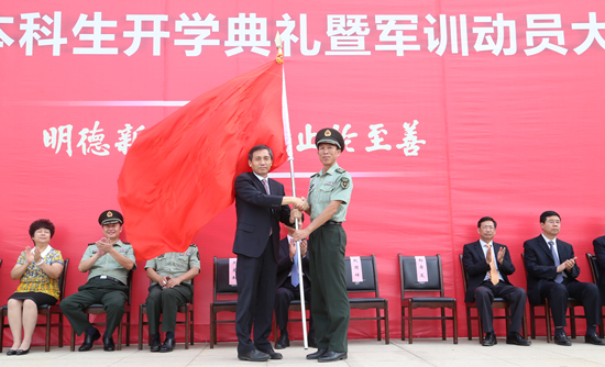 伴随着热烈的掌声与乐曲,校党委书记关爱和向军训团团长授团旗,这标志着我校2016级本科生集中军事训练全面展开。