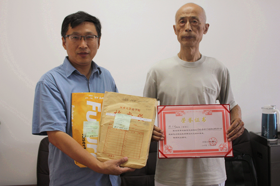 2016年6月29日上午,我校著名校友陈梓北先生的儿子陈文明向我校档案馆无偿捐赠其父亲创作作品手稿11件。档案馆馆长齐彦波代表学校对陈文明先生的无私捐赠表示感谢,并向其颁发了捐赠证书。