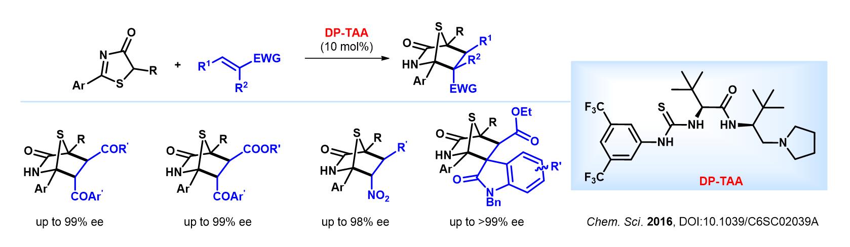 近年来,江智勇博士课题组已相继发展了氨基酸衍生硫脲型Brønsted碱(Angew. Chem. Int. Ed. 2012, 51, 10069–10073;Angew. Chem. Int. Ed. 2013, 52, 6666–6670;Org. Lett. 2013, 15, 2358−2361)及脲型Brønsted碱(J. Org. Chem. 2015, 80, 7770−7778;J. Org. Chem. 2015, 80, 12686−12696;Org. Chem. Front. 2016, 3, 470−474;Angew. Chem. Int. Ed. 2016, 55, 1299−1303)催化的系列不对称反应。近日,他们发展了一类新型二肽类衍生多官能团Brønsted碱催化剂,并成功应用于5H-thiozol-4-ones与活化烯烃的[4+2]环加成反应。该类型催化剂的重要性不仅在于结构新颖、可调性强,更重要的是它具有与众不同的催化活性,如能够使5H-thiozol-4-ones与活化烯烃在手性有机催化剂下只能进行共轭加成的已报道反应改变其化学选择性,即发生[4+2]环加成反应,首次高化学选择性与立体选择性完成了重要的1,4-硫桥-哌啶酮骨架的不对称合成。该研究成果已在国际化学顶级期刊《Chemical Science》(影响因子9.211)上在线发表,题为“Asymmetric [4+2] Annulation of 5H-Thiazol-4-Ones with a Chiral Dipeptide-Based Brønsted Base Catalyst”(DOI: 10.1039/C6SC02039A)。Chemical Science是英国皇家化学会RSC的旗舰期刊(Flag Journal),与美国化学会的J. Am. Chem. Soc.及德国Wiley的Angew. Chem. Int. Ed.并列为化学顶级期刊。