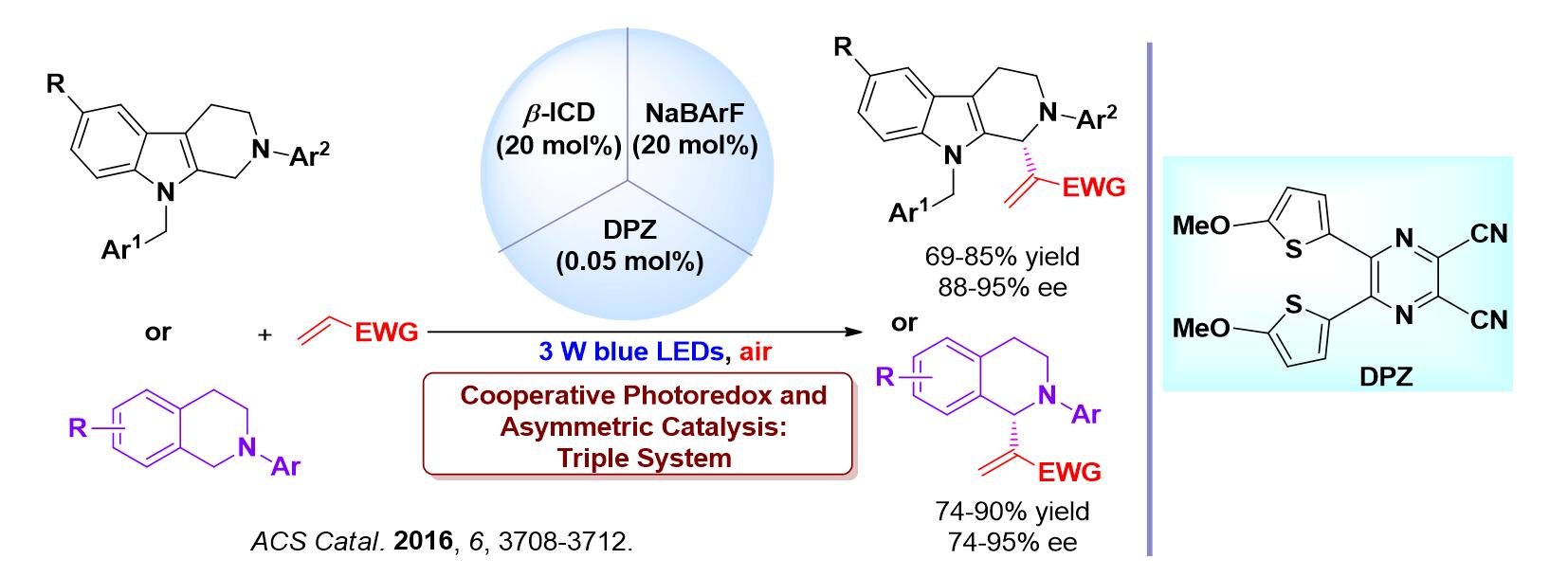 同时,江智勇博士课题组在其自身发展的DPZ有机可见光催化剂参与的可见光催化研究基础上(RSC Adv. 2014, 4, 30062−30067;Angew. Chem. Int. Ed. 2015, 54, 11443−11447),结合在不对称有机催化方面的经验,近期报道了DPZ参与的可见光不对称协同有机催化。他们通过建立DPZ、手性Lewis碱、Lewis酸的新颖高效的催化体系,高立体选择性完成了β-carbolines及N-THIQs与活化烯烃的不对称烯基化反应。该研究是β-carbolines首次在可见光催化中得到应用,也是可见光不对称协同催化首次在有氧条件下收获高产率的报道。该研究工作于近期发表在催化领域顶级期刊ACS Catalysis(影响因子:9.312)。