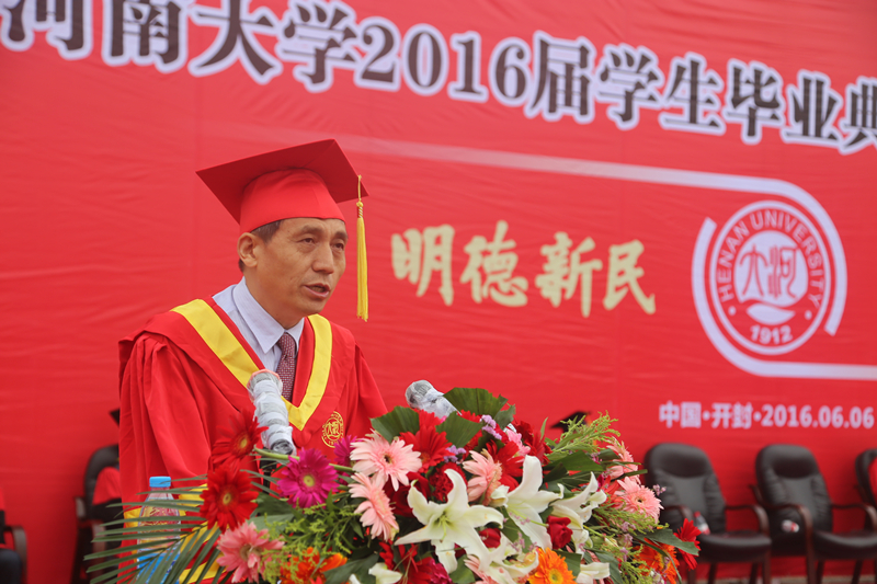 每个学院的发展都可以讲出许多感人至深的执着的故事。这是我们办学精神的底色,也是我们重要的思想财富。新闻与传播学院的常萍老师以30余年的讲台上的执着告诉我们,生命中还有诗和远方。教育科学学院的李申申老师,连续三年获批国家社科项目的成绩,让我们知道年过花甲之后的执着,也会有厚积薄发。我们的学校,生源是最好的生源,校舍是体面的校舍。我们没有让人羡艳的桂冠,没有可以夸耀于人的名分,我们不必因此而妄自菲薄。我们希望每个河南大学的毕业生,都是一张名片,用各自的成功,证明河大办学的质量;我们也希望各位在以后填写毕业院校时,能毫不犹豫地自豪写下“河南大学”四个字。河南大学的名分,写在共和国河流山川上,写在老百姓口口相传中。当然,河南大学也需要发扬坚韧执着的精神,向至善的境界与目标继续前行。坚韧执着缘于自信,自信我们过去、现在都是可圈可点的,自信我们的将来更是光辉灿烂的。中国浩浩荡荡的现代化大潮,需要更好的教育支撑。在中国创建一流大学的进程中,我们不甘平庸地跟上,就会有更加美好的未来。