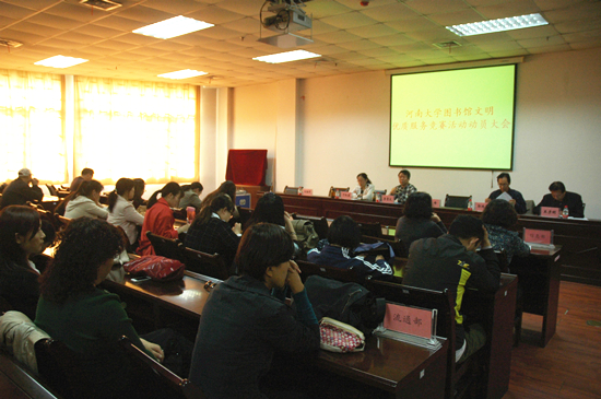 4月28日下午,在金明校区图书馆一楼会议室,图书馆召开了2016年文明优质服务竞赛活动动员大会。会议由图书馆副馆长于红英主持。全体领导班子和全体职工与会。