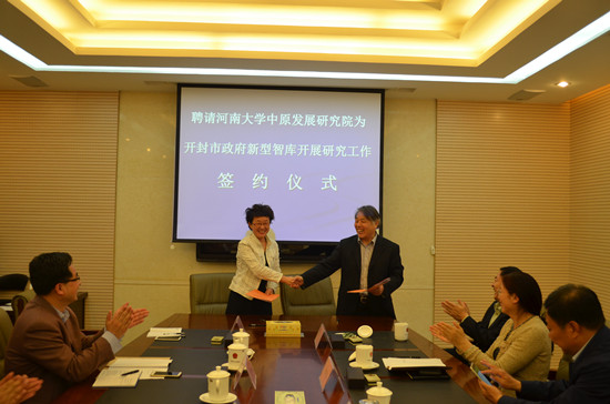 4月26日下午,开封市政府举行聘请河南大学中原发展研究院为开封市政府新型智库签约仪式,正式聘请河南大学中原发展研究院为开封市政府新型智库。 签约仪式由开封市政府副秘书长范西荣主持。