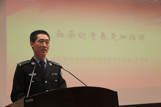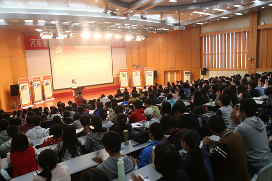 报告会上,李博亚、孙锦峰等6名报告团成员用朴实的话语、鲜活的事例给大家上了一堂生动的思想政治教育课。他们中有面对滚滚车轮奋不顾身的“90后最美铁警”、来自河南警察学院的学生李博亚;有积极探索新时期思想政治教育新途径、受到习近平总书记亲切接见的郑州大学公共卫生学院辅导员孙锦峰;有见义勇为、为救落水儿童而不幸牺牲的华北水利水电大学学生孟瑞鹏(由其同学吴菲菲讲述);有用爱点燃孩子梦想的濮阳市濮阳县徐镇镇昆吾社区小学教师杨承;有带着父亲上学、懂得知恩图报的黄淮学院自强女孩张海霞;有为了祖国基层教育事业勤勤恳恳、鞠躬尽瘁、以身殉职,来自周口市郸城县秋渠一中的前校长张伟(由现任校长刘中华讲述)。一件件真实感人的事迹,带给师生们的不仅是震撼和感动,更是激励和鼓舞。