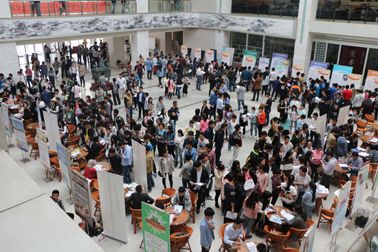 金明校区图书馆一楼大厅的招聘会现场,涉及科技、医药、信息、教育等领域的用人单位吸引了众多毕业生前来应聘,怀揣简历的同学们在各自心仪的企业展区前紧张而有序地排队面试。他们详细了解相关企业信息,互相交流面试经验,并结合个人情况,积极寻求适合自己的岗位。面试过程中,毕业生有礼有节、神情自若、对答如流,体现了我校学生的良好风采。“真正来面试才知道自己与职业需求标准还有一定的差距,在以后的工作中会不断学习,继续提高自身的能力水平。”刚刚结束软件开发方向工作面试的2012级信息与计算机科学专业的张威威说到。