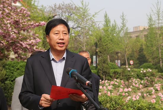 2015年10月,潭头镇任景岳先生“护送”这两株牡丹来到河大。除草、浇水、施肥,半年多的精心照料,这两株被命名为“河大红”的牡丹终于开花了。2016年4月8日上午,我校在明伦校区七号楼前的牡丹园中举行“同赏河大红,共话潭头情”牡丹园开园仪式。任景岳老先生在潭头镇党委书记谭建峰陪伴下来到河大,和河大师生一起同赏河大红,共话潭头情。