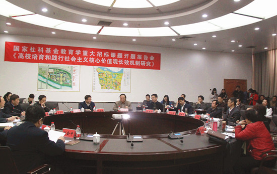 3月27日上午,国家社会科学基金(教育学)重大招标课题“高校培育和践行社会主义核心价值观长效机制研究”开题报告会在我校金明校区行政楼152会议室举行。河南省哲学社会科学规划办公室主任李玉中、河南省教育科学研究所所长兼教育科学规划办主任郭国侠,校党委常委、常务副校长赵国祥,校党委常委、副校长刘志军出席会议,教育科学学院相关负责人和部分师生与会。会议由我校社科处处长杨国安主持。