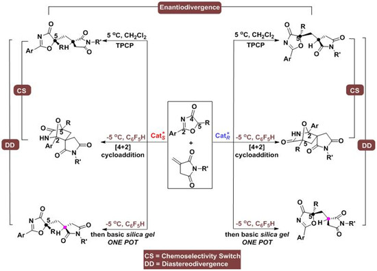 化学选择多样性能够极大提高合成效率,有利于合成出多类型复杂化合物,因此在化学合成中具有举足轻重的地位。江智勇教授课题组一直致力于该方面研究工作,并已使用可见光催化手段在非手性化合物的化学选择多样性合成上取得进展(Angew. Chem. Int. Ed.2015, 54, 11443−11447)。然而,在不对称催化中实现这一目标更具挑战性,迄今国际上相关报道极少。