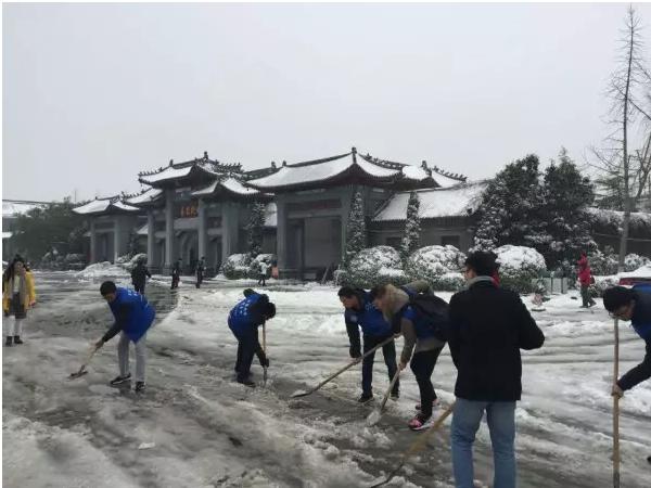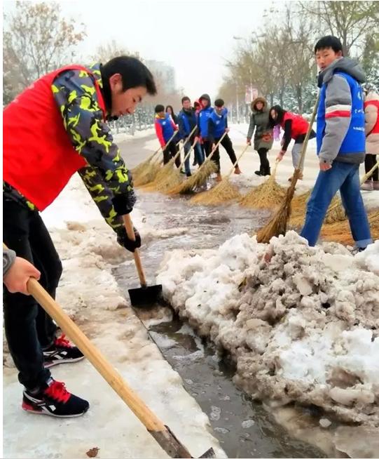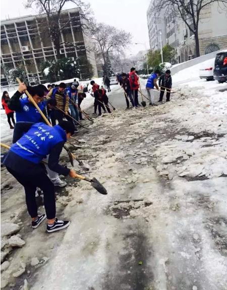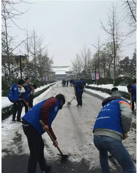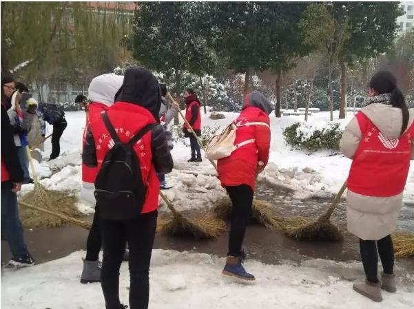 校团委组织校学生会、青年志愿者,冒着严寒,积极清理校园道路积雪。