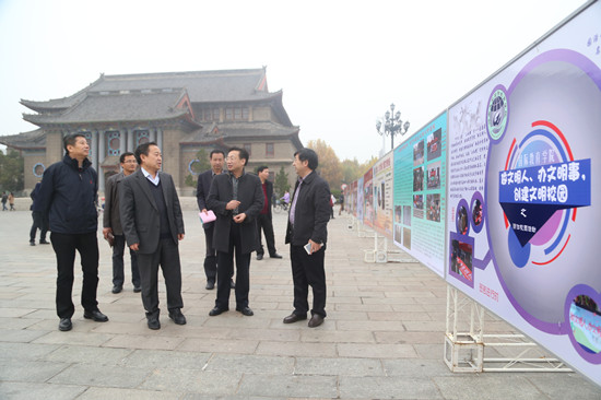 汇报结束后,检查组一行沿博雅路实地考察了我校精神文明创建工作,在大礼堂广场参观了社会主义核心价值观展板,并对相关档案材料进行了认真查看。考察过程中,检查组对我校开办社会主义核心价值观大讲堂、营造浓厚的精神文明创建氛围以及利用新媒体传播精神文明等特色活动和做法给予了充分肯定。