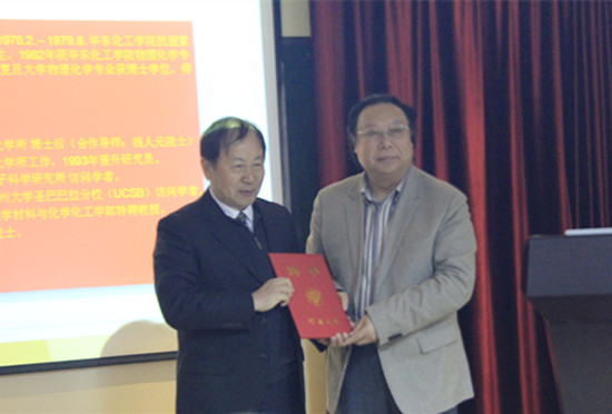 2015年11月6-7日,应我校纳米材料工程研究中心邀请,中国科学院化学研究所李永舫院士来我校进行学术交流。6日上午,常务副校长赵国祥在纳米材料工程研究中心二楼报告厅为李永舫院士颁发了河南大学兼职教授聘书,聘任仪式由纳米材料工程研究中心主任张平余教授主持。