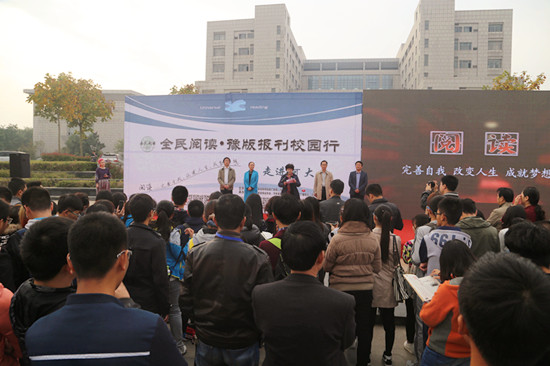 赵艳表示,举办“全民阅读•豫版报刊校园行”活动是为了贯彻落实党的十八大关于“开展全民阅读活动”的精神要求,激发全民读书热情,推动我省文化大发展大繁荣。她说,河南大学是“豫版报刊校园行”活动的第二站,希望通过举办本次活动带动广大师生关注阅读、感受阅读、爱上阅读,从而推动全社会阅读的高潮,进一步激发全省人民为建设幸福河南而贡献力量。