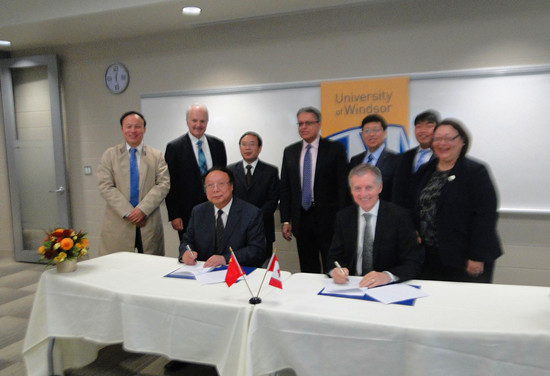 赵国祥(前左)与温莎大学校长Alan Wildeman(前右)签署两校合作协议