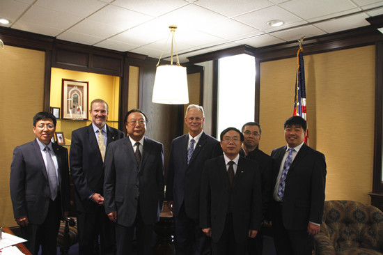 赵国祥(左三)会见美国阿克伦大学校长Scott Scarborough(左四)、副校长William Sherman(左二)