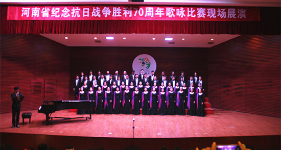 歌声飘过七十年,忆抗战胜利不朽荣光;历史已尘埃落定,革命先烈崇高精神难以忘怀。近日,“河南省纪念抗日战争胜利70周年”歌咏比赛落下帷幕,我校选手凭借出色发挥夺得了一等奖、总分第一名的好成绩。10月13日下午,比赛现场展演于郑州大学西亚斯国际学院2号音乐厅成功举办。河南省教育厅副厅长刁玉华等领导出席活动。我校合唱团受邀参加展演,校党委宣传部、艺术学院相关老师带队参与活动。