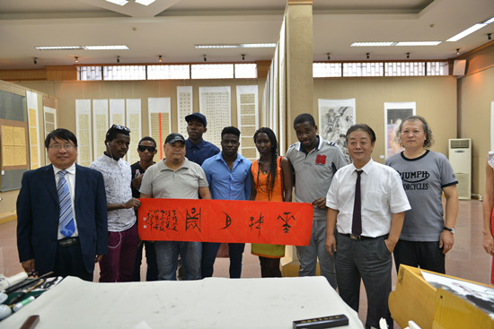 最后,与会领导带领留学生们参观了艺术学院的书法、绘画展,美术名家彭西春教授现场作画“清香图”,以荷花之高洁寓意未来文化交流之美好前景,书法家池献平教授以甲骨文现场题“花好月圆”喜迎留学生及中秋佳节。“清香图”赠与来自俄罗斯的玛蒂娜同学、“花好月圆”赠与来自非洲乌干达的李雅,使中秋系列活动达到又一个高潮。