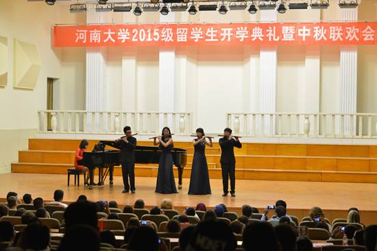 会议第二部分是由艺术学院的师生们带来的中秋民乐专场音乐会。古筝、葫芦丝、二胡、唢呐等多种乐器的多种表演形式使整场中秋联欢沉浸在优美的旋律中。其中,由汉民族传统乐器古筝齐奏的曲目《战台风》淋漓尽致展现了弹拨乐器古筝之美——急时如狂风骤雨,舒缓时如夕阳晚照;颇具中国西南少数民族特色的葫芦丝齐奏《美丽的金孔雀》旋律优美动听,傣族姑娘舞蹈的身影呼之欲出;河南古筝曲《渔舟唱晚》的演奏为听众呈现了夕阳西下、湖光山色的画面及渔人满载而归的喜悦;更有二胡独奏《豫乡行》带有浓郁的河南地方特色。现场的表演精彩纷呈,留学生们时而沉浸其中,时而爆发出热烈掌声。