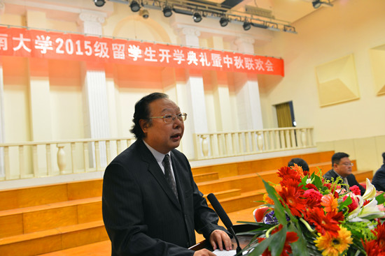 首先进行的是河南大学2015级留学生开学典礼。赵国祥致欢迎辞,对留学生的到来表示欢迎,并从河南大学的历史渊源、现存古迹、师资力量、学位设置、学科现状、馆藏图书等多方面、全方位地介绍了河南大学的概况。他表示,中华民族是好客民族,向来有“有朋自远方来,不亦乐乎”的情怀,同时在与人交往时立足于“善”和诚信,河南大学的老师会像家人一般给留学生们最大的关怀,宽慰在异乡求学的留学生们“河大是新家,是国际大家庭”。赵国祥还对往届留学生们在河南大学学习期间取得的成绩进行了表彰,希望2015级新生能再接再厉,在文化上相互交流,习惯上相互理解,困难时相互帮助,共同见证在河大的难忘时光,成为中外交流的友好使者,成为河南大学与外交流的桥梁。