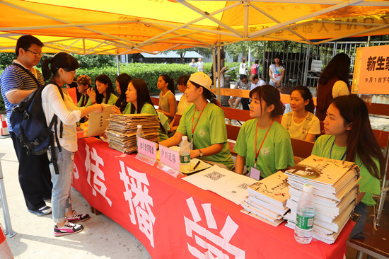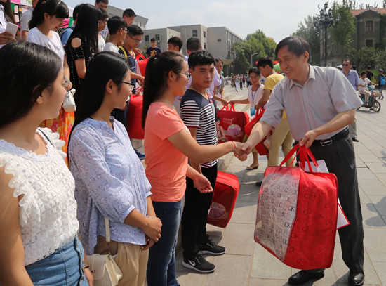 在两个校区的迎新服务总站,校领导们耐心地听取各学院负责人介绍迎新工作的具体举措,并不时与前来报到的新生及家长交谈,询问他们入学报到的相关事宜,祝愿他们在校期间学习生活愉快。校领导代表学校向家庭经济困难学生代表送上内含被子、毛巾等生活用品的“爱心大礼包”,鼓励他们在今后的大学生活中发扬艰苦朴素、勤奋好学的精神,早日成为社会栋梁之才,并承诺学校会尽力帮助他们克服困难,顺利完成学业。“没想到刚来学校就能收到这么贴心的礼包,真心感受到了学校对我们的关怀”,马克思主义学院的张媛媛拿着刚领到的大礼包,笑着对记者说。