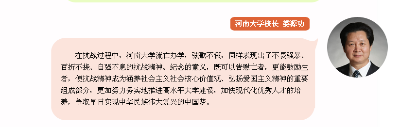全民族抗战胜利虽然已经过去了70年,但是硝烟已散,精神永存。在中国人民抗日战争的壮阔进程中,全民族形成了天下兴亡、匹夫有责的爱国情怀,凝聚了视死如归、宁死不屈的民族气节。抗战中迸发出的伟大精神,穿越了历史,辉映着未来,永远激励着我们前进。在抗战过程中,河南大学流亡办学,弦歌不辍,同样表现出了不畏强暴、百折不挠、自强不息的抗战精神。纪念的意义,既可以告慰亡者,更能鼓励生者,使抗战精神成为涵养社会主义社会核心价值观、弘扬爱国主义精神的重要组成部分,更加努力务实地推进高水平大学建设,加快现代化优秀人才的培养,争取早日实现中华民族伟大复兴的中国梦。