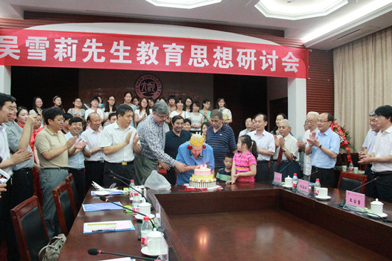 研讨会结束,欢快的歌声响起。关爱和扶着吴雪莉走到蛋糕旁边,和她一起插上蜡烛,一起高唱“Happy birthday to you ”。全场欢声笑语,大家一起祝愿吴雪莉老师90岁生日快乐、健康长寿!继续在中原大地上书写自己的传奇!