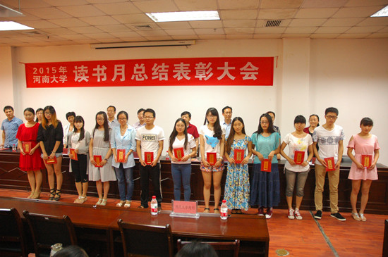 2015年6月30日下午,河南大学2015年读书月总结表彰大会在金明校区图书馆一楼会议室召开。副校长张宝明,相关部门负责人出席了会议。图书馆党总支书记郭鸿昌主持会议。