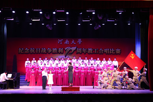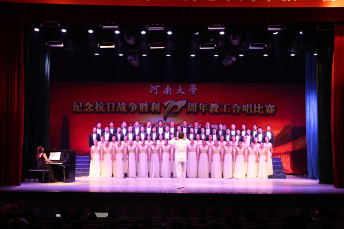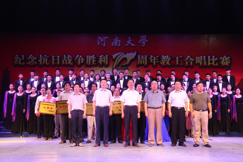 2015年是中国人民抗日战争暨世界反法西斯战争胜利70周年。6月18日下午,来自我校15个单位的教职工合唱团齐聚大礼堂,吟唱难忘的岁月,演绎时代的激情,用合唱比赛的形式共同纪念这一伟大的历史性事件。校长娄源功,常务副校长赵国祥,副校长刘先省、许绍康,校纪委书记雷霆,校工会主席朱恒宽,校长助理何喆,总会计师韩守富与2000余名师生代表共同观看了比赛。