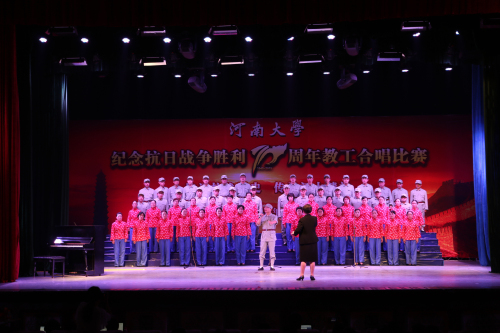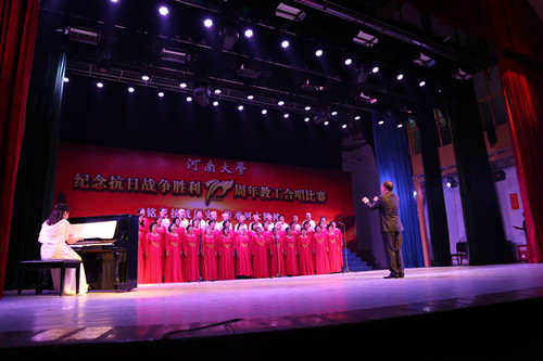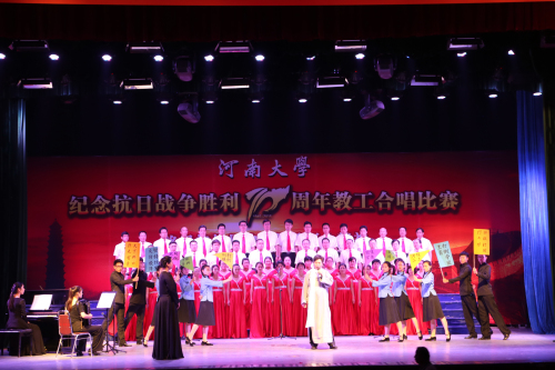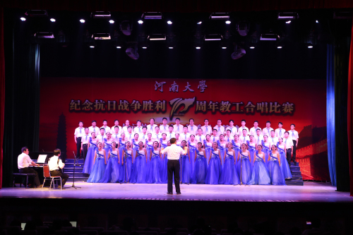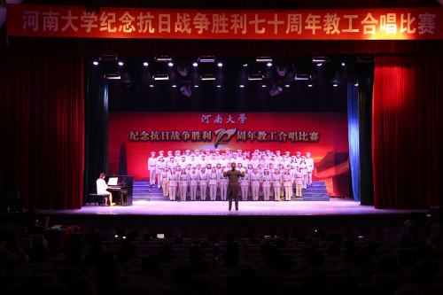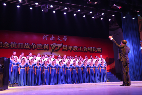 为了提高校歌在教职工中的传唱度,主办方确定校歌为每个代表队预赛时的必唱曲目。排演期间,校歌成为教职工中的“流行歌曲”,歌声不时响起在河大园的各个角落。在决赛接近尾声时,校领导走上舞台,全体人员起立,大家齐声高唱,“嵩岳苍苍,河水泱泱,中原文化悠且长……”校歌再一次响彻大礼堂,壮志与豪情写在每个人的脸上。