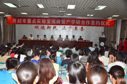 5月26日上午,开封市重点实验室揭牌仪式暨河南大学与企业的产学研合作签约仪式在河南大学化学化工学院学术报告厅举行。副校长刘先省、开封市副市长孙晓红,企业界代表以及化学化工学院师生代表近500余人参加仪式。揭牌暨签约仪式由化学化工学院党委书记方蒙主持。
