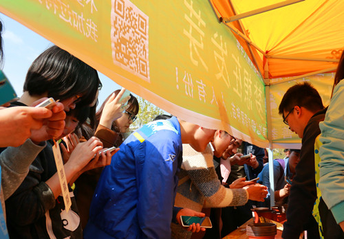 “不要拒绝扫我噢!”、“我是加过特技的!”绿色横幅上可爱有趣的标语吸引了众多同学前来参与活动。手机扫描二维码,完善教育信息,通过“摇一摇”的方式即可获得佛甲草。短短两个小时,1500余株佛甲草和500余个花盆全部领养完毕。
