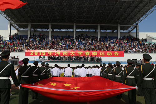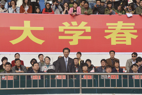 校长娄源功宣布河南大学2015年春季运动会正式开幕。音乐回响,歌声悠扬,各学院轮番带来的精彩文体表演,将现场气氛推向高潮。