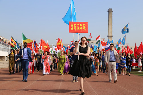 伴随着昂扬雄浑的运动员进行曲,国旗队、校旗队、花束队、彩旗队踏着激昂的节奏,引领各学院运动员组成的方阵依次入场。27支参赛队伍迈着铿锵有力的步伐、喊着高亢嘹亮的口号从主席台前走过,他们以必胜的信心和饱满的激情接受领导和师生的检阅。值得一提的是,国际汉学院来自不同国家的留学生们继去年之后继续参加春运会,为赛场带来更多精彩的同时,也让今年的春运会更具“国际范儿”。