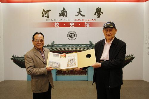 在校史馆,李来柱上将把自己的作品《办校育人》、《李来柱回忆录》、《李来柱诗记》和一幅墨宝“教育为先,励人成长”赠予我校,我校回赠一套百年校庆纪念邮票以表示感谢。