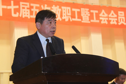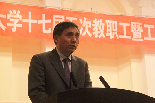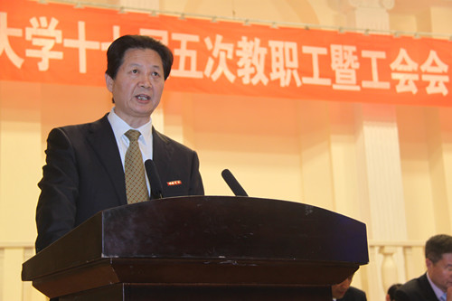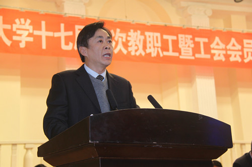 校党委书记关爱和致开幕词。他指出,全校教职工在学校党委和行政的正确领导下,深入学习贯彻党的十八大、十八届三中、四中全会和习近平总书记系列重要讲话精神,谋划综合改革,推进依法治校,明确发展道路,求真务实,扎实工作,学校的各项事业呈现出蓬勃发展的良好势头,办学优势更为突出,办学特色更为鲜明,综合实力显著提升,建设高水平大学的基础更加坚实。关爱和表示,去年年底胜利召开的第十次党代会明确提出,将继续坚持“一条主线,两大突破,五大战略”工作思路,探索实践“国家一流、区域引领、中原风格”的发展道路,为学校的改革发展进一步指明了方向。