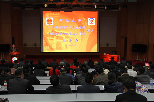 3月25日下午,学校在金明校区计算机大楼二楼报告厅召开学习传达全国“两会”精神报告会。全体在校校领导,中层干部,各民主党派、台侨联负责人,市级以上人大代表和政协委员,离退休老同志代表及研究生和本科生代表参加了报告会。会议由常务副校长赵国祥主持。