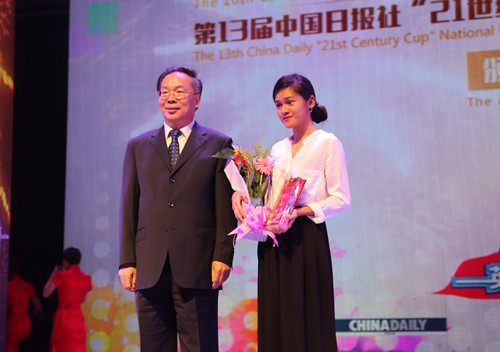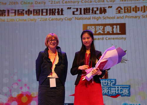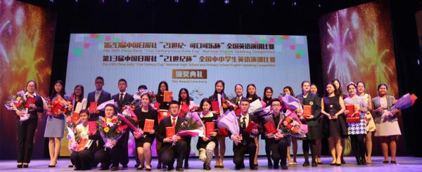 3月22日,第20届中国日报社“21世纪•可口可乐杯”全国英语演讲比赛和第13届中国日报社“21世纪•联想杯”全国中小学英语演讲比赛总决赛在我校大礼堂落下帷幕。中国日报社社长朱灵,全国人大常委会委员、外事委员会副主任委员赵白鸽,全国政协外事委员会副主任王国庆,中国宋庆龄基金会副主席、中国翻译协会常务副会长唐闻生,省委常委、宣传部长赵素萍,副省长王艳玲,省教育厅厅长朱清孟,校领导娄源功、赵国祥、刘志军等出席颁奖典礼。