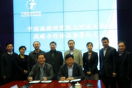 1月22日上午,河南大学与中国旅游研究院战略合作协议签字仪式在北京举行,中国旅游研究院院长戴斌、副院长张栋,校长娄源功、副校长张宝明等出席了签字仪式。签字仪式由中国旅游研究院科研管理部主任夏少颜主持。