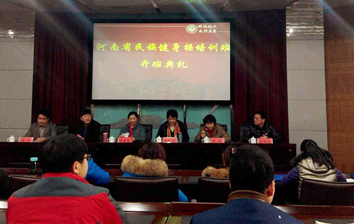 1月10日上午,河南省民族健身操培训班开班典礼在我校金明校区行政楼151会议室举行。省民族事务委员会副主任王平鸽、民族一处调研员周伟、副处长张运涛,省体育局群体处副处长杨荷燕,省少数民族体育协会与我校体育部相关负责人,以及来自全省各高校的少数民族传统体育项目训练基地、活动基地的20余名参训学员参加开班典礼。开班典礼由周伟主持。